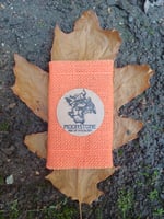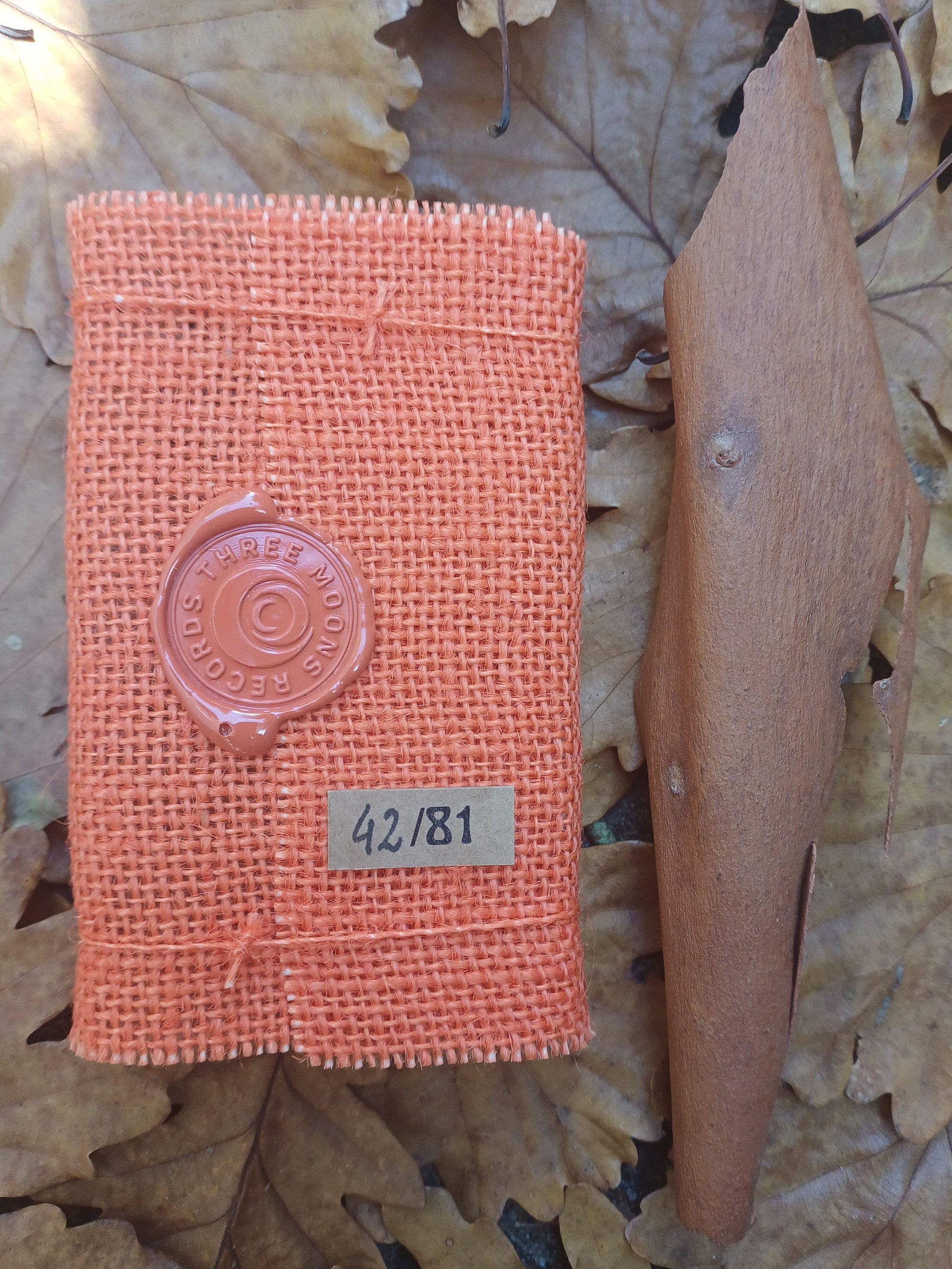 Fosfo-orange tape housed in heavy decorative die cut cardboard case made of eco paper. Kept in orange jute slipcase and sealed with orange wax.